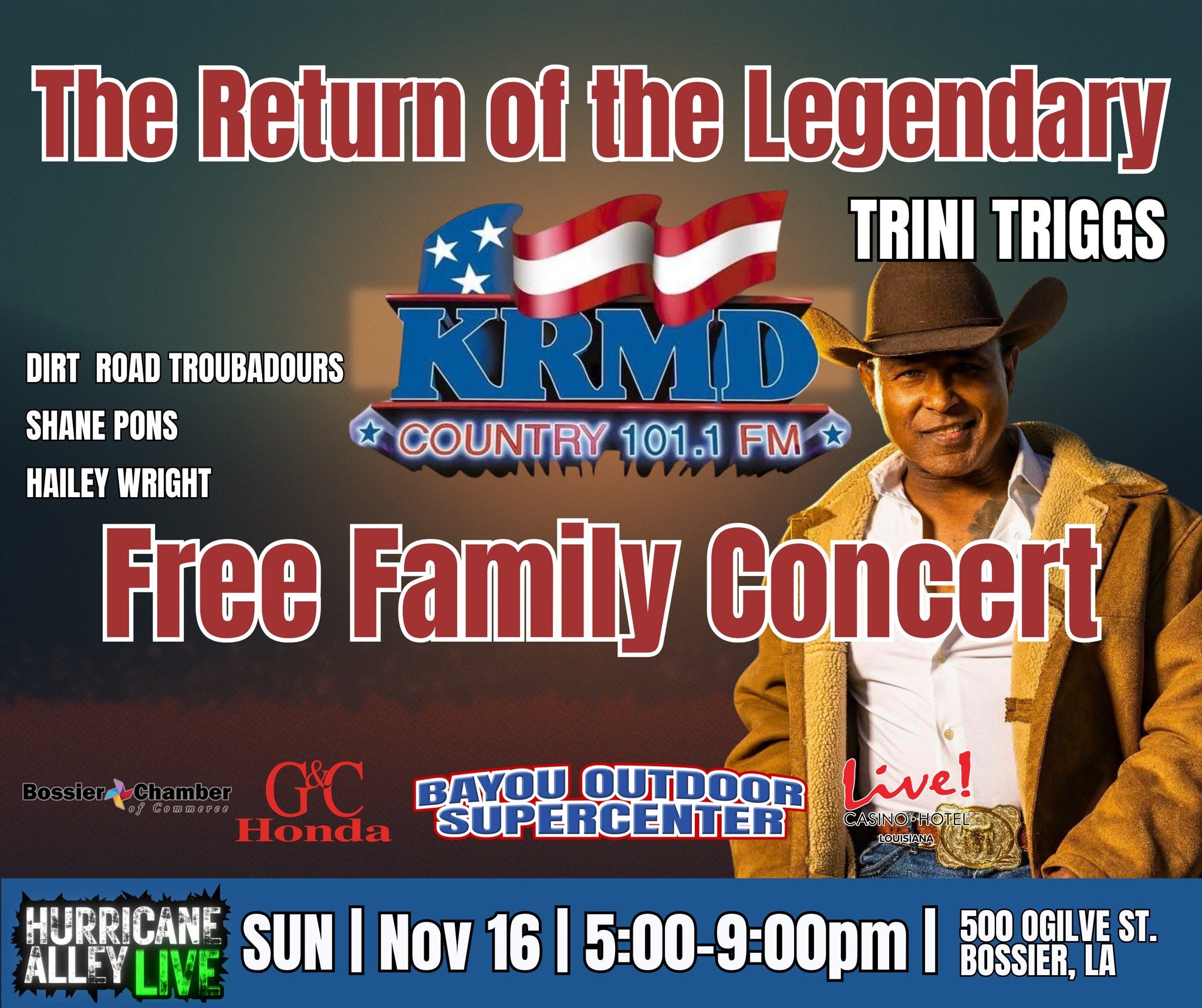 Sunday from 5 to 9 pm, it’s the return of a live country music tradition: the KRMD Free Family Concert. Featuring Trini Triggs, Dirt Road Troubadours, Shane Pons and Hailey Wright.