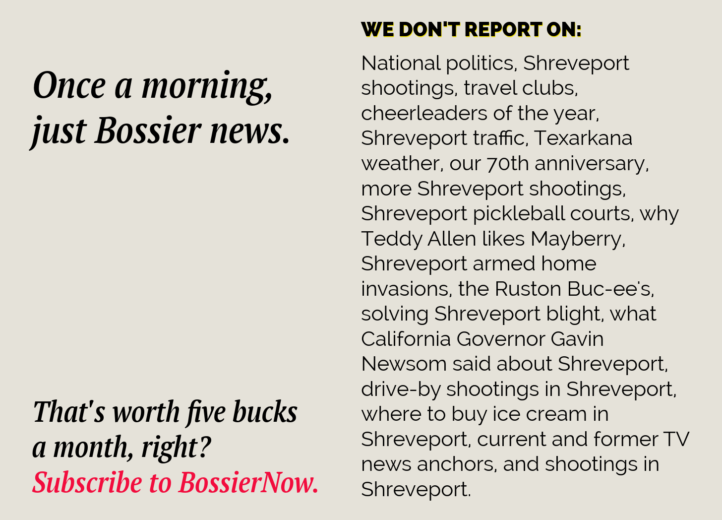 BossierNow’s mission is to provide independent, conflict-of-interest-free news coverage of Bossier City and Bossier Parish. We welcome your input, press releases, and news tips at email@bossiernow.com.