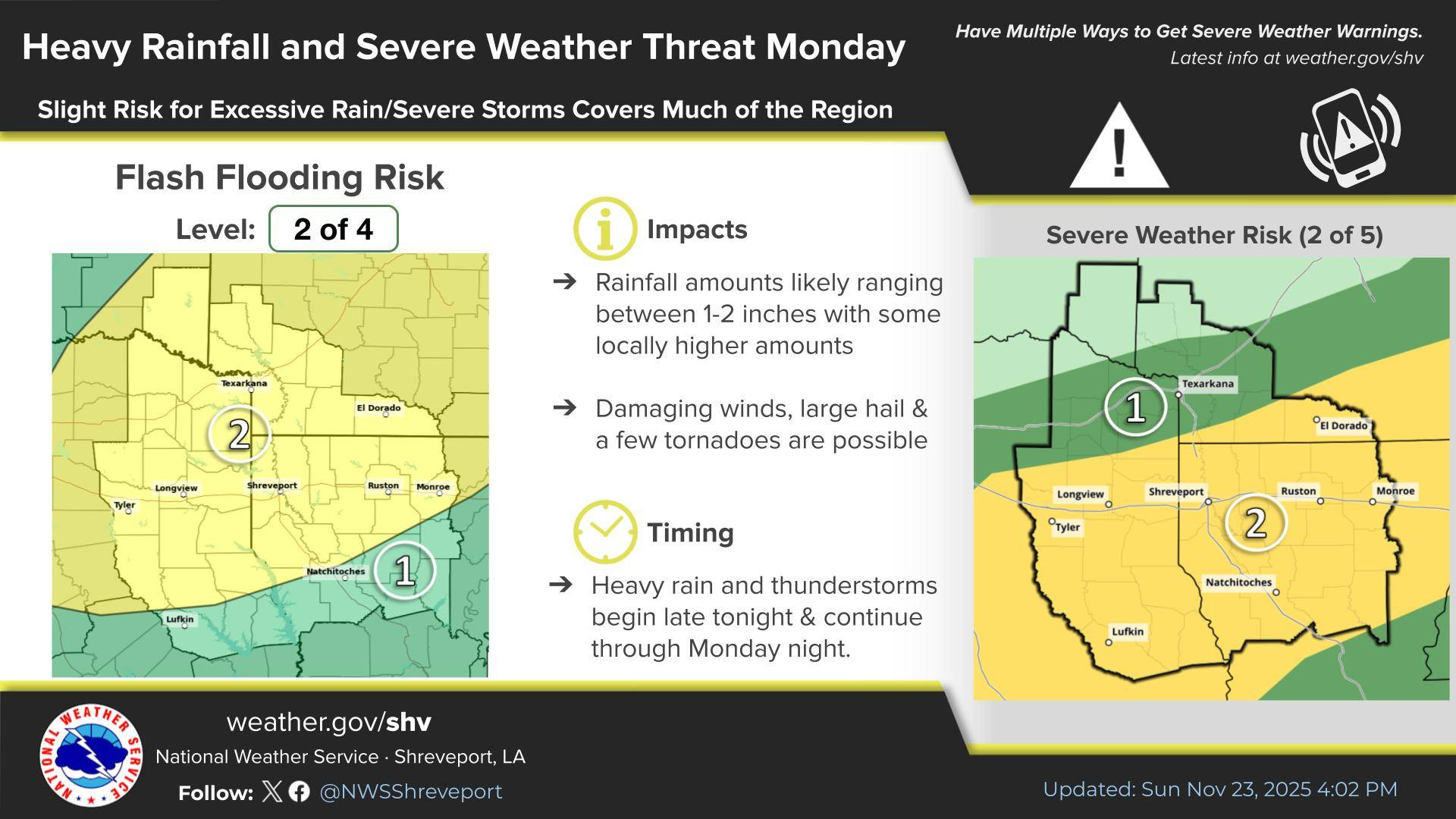 The National Weather Service is expecting excessive heavy rainfall and some severe weather to impact the region on Monday, continuing through at least Monday night.