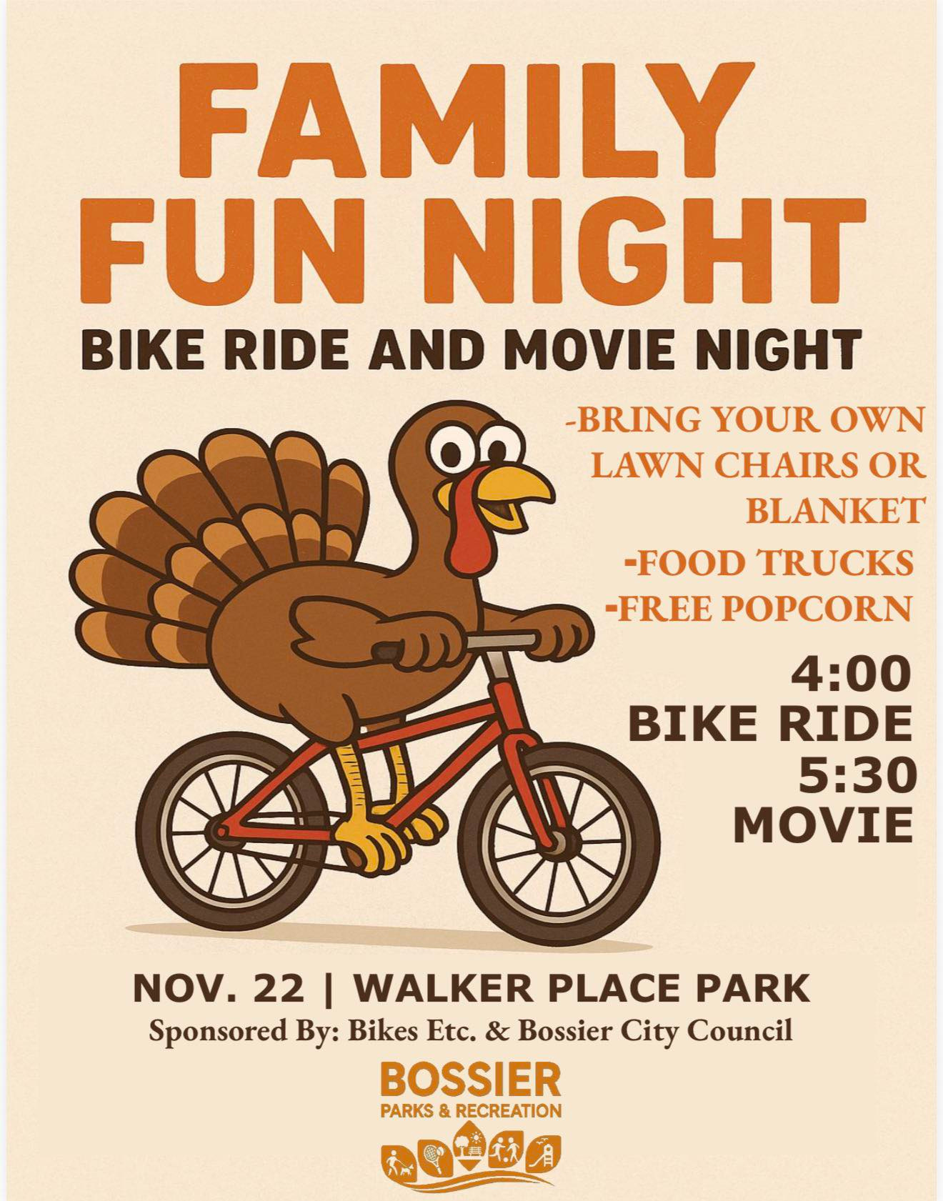 The City of Bossier City and Bikes Etc. are sponsoring a family bike ride followed by a family-friendly movie at Walker Place Park on Saturday, November 22.