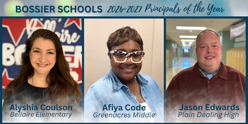 Bossier Schools Superintendent Jason Rowland and district administrators surprised Alyshia Coulson, Afiya Code and Jason Edwards with the news they will represent Bossier Parish as the 2026-27 Principals of the Year and advance to the next level of the Louisiana Principal of the Year competition.